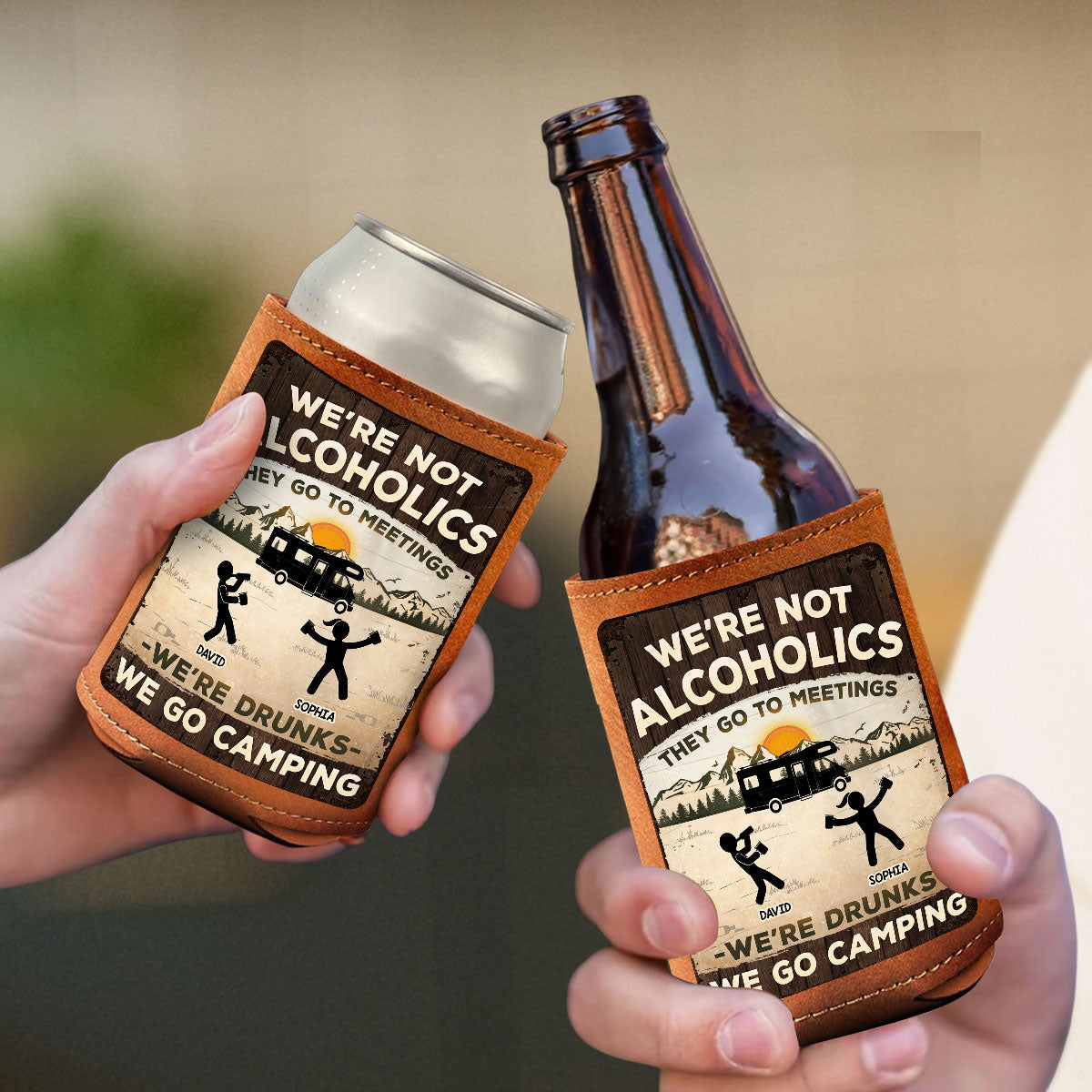 Alcoholics Go to Meetings We Go Camping - Personalized Custom Leather Can Cooler Holder