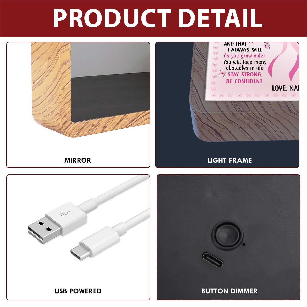 Indulge in the enigmatic allure of our multi-functional mirror. The elegant magic mirror not only functions as a normal mirror. but also reveals a hidden. sentimental message when the light is turned on. A perfect meaningful and surprising gift for your beloved ones.