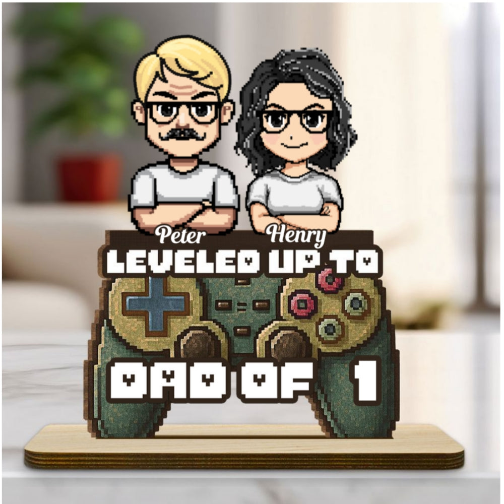 Leveled Up To Dad - Personalized Custom 2-Layer Wood Plaque With Flat Base