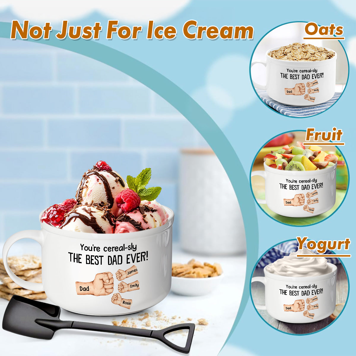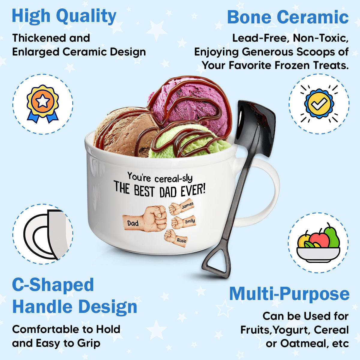 Large ice cream bowl with matching scoop and spoon for extra fun and satisfaction. Perfect for enjoying more ice cream. cereal. and sweet moments together